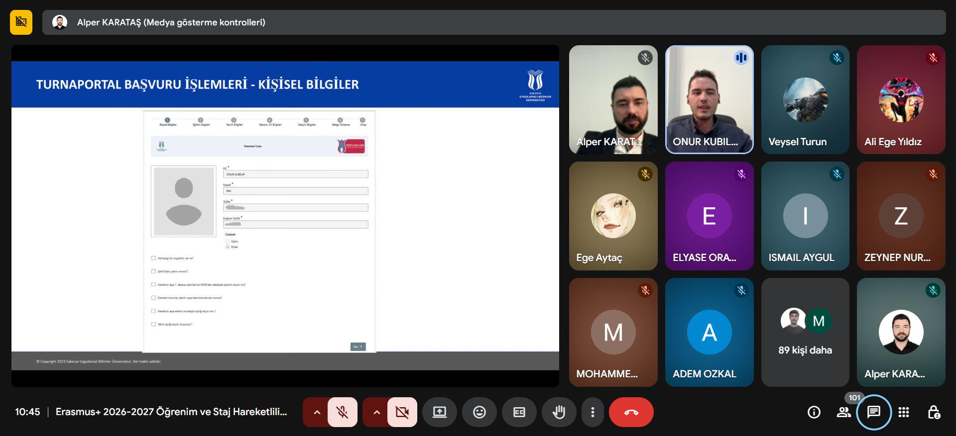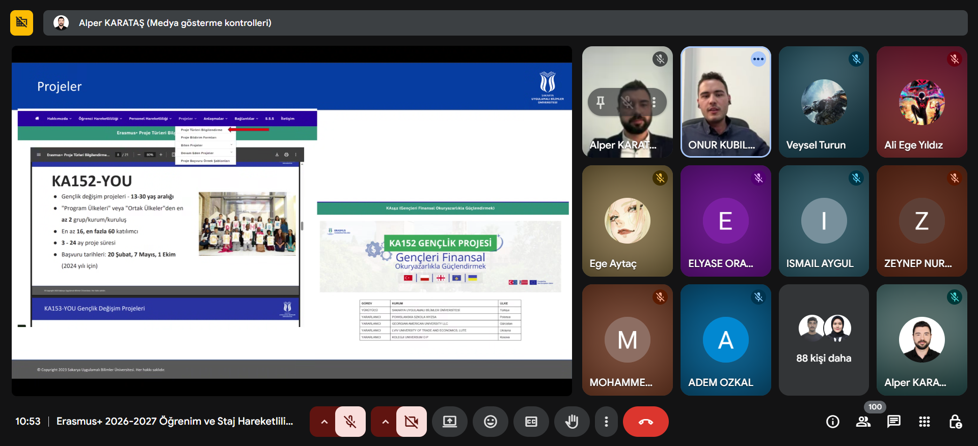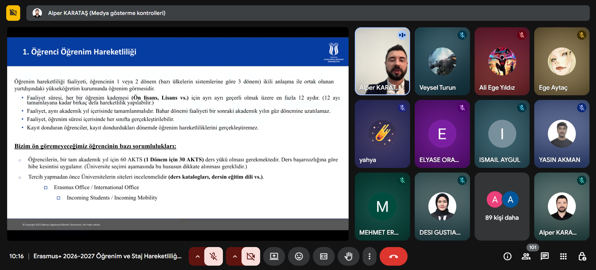 Ofisimiz tarafından, tüm öğrencilerimize yönelik Erasmus+ Değişim Programı olanakları hakkında bilgilendirme toplantısı düzenlendi.5 Kasım 2025 tarihinde çevrimiçi olarak gerçekleştirilen toplantıda, Erasmus projeleri kapsamında öğrencilere sunulan yurt dışı öğrenim staj hareketliliği olanakları ele alındı. Katılımcı öğrencilerimize Erasmus programında hareketlilik şartları, seçim kriterleri gibi hususlardan detaylı olarak bahsedildi. Sonrasında başvuru ekranı ve başvuru işlemlerinde dikkat edilmesi gereken konular üzerinde detaylı bilgilendirmeler yapıldı. Ardınan KA171 hareketlilik olanakları ve öğrenciler için uygun olabilecek Erasmus proje başvuru türlerinden de bahsedildi.