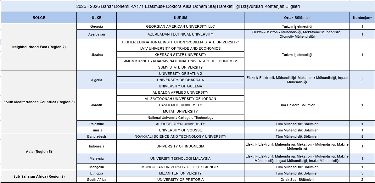 | Erasmus+ Doktora Kısa Dönem Staj Hareketliliği | Minimum 5, maksimum 30 gün |