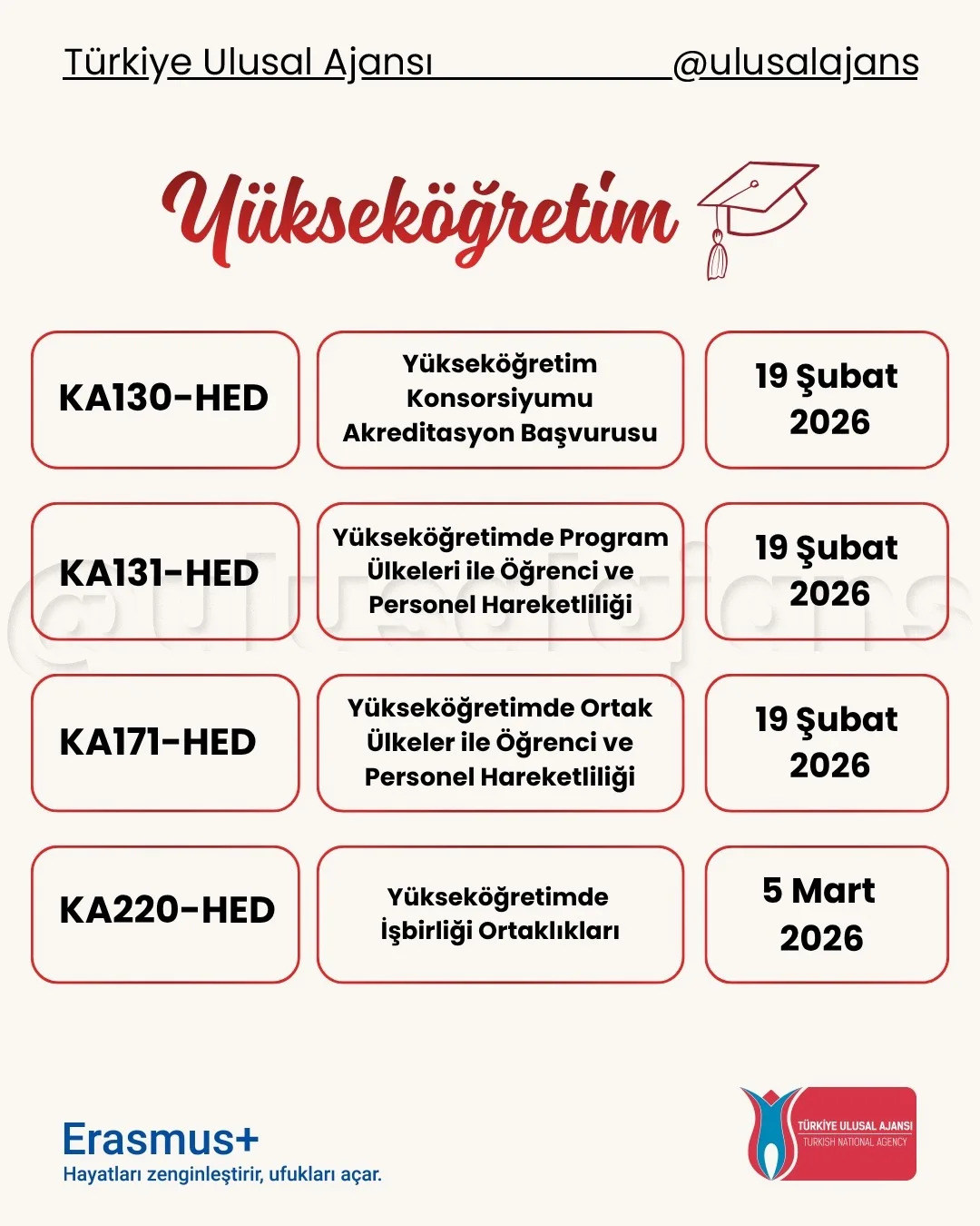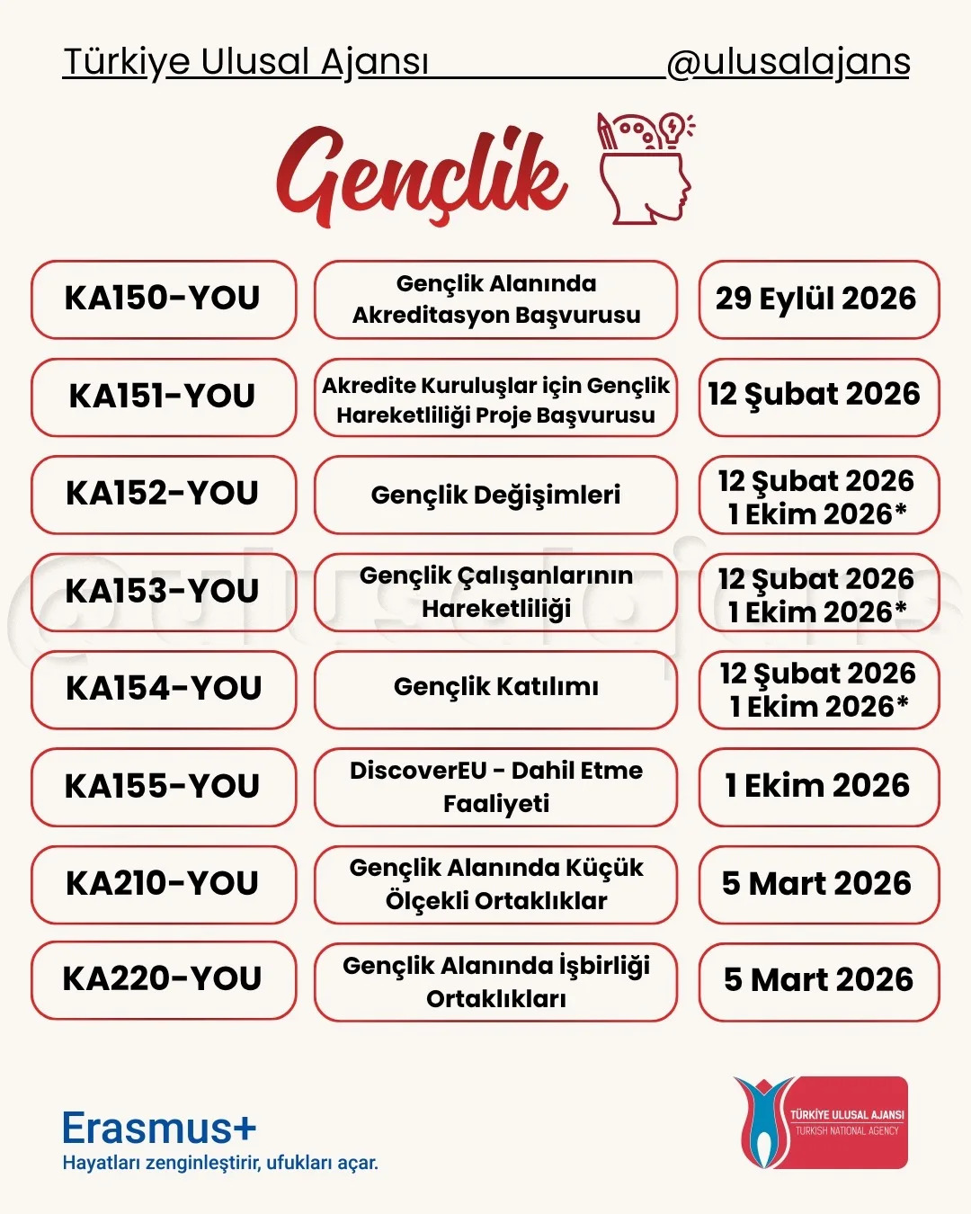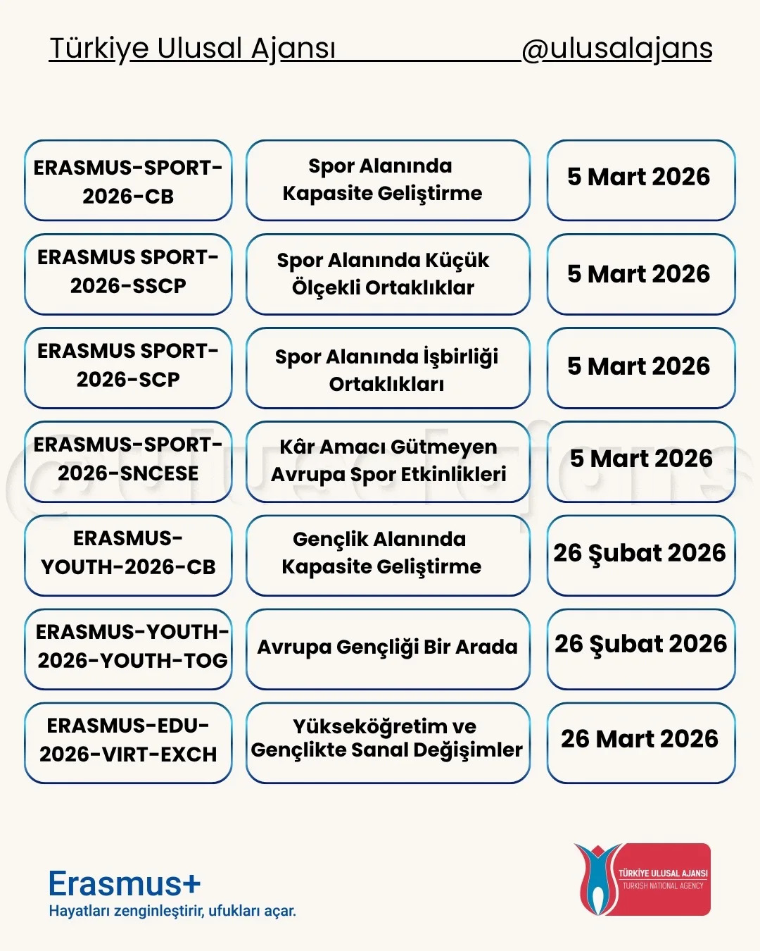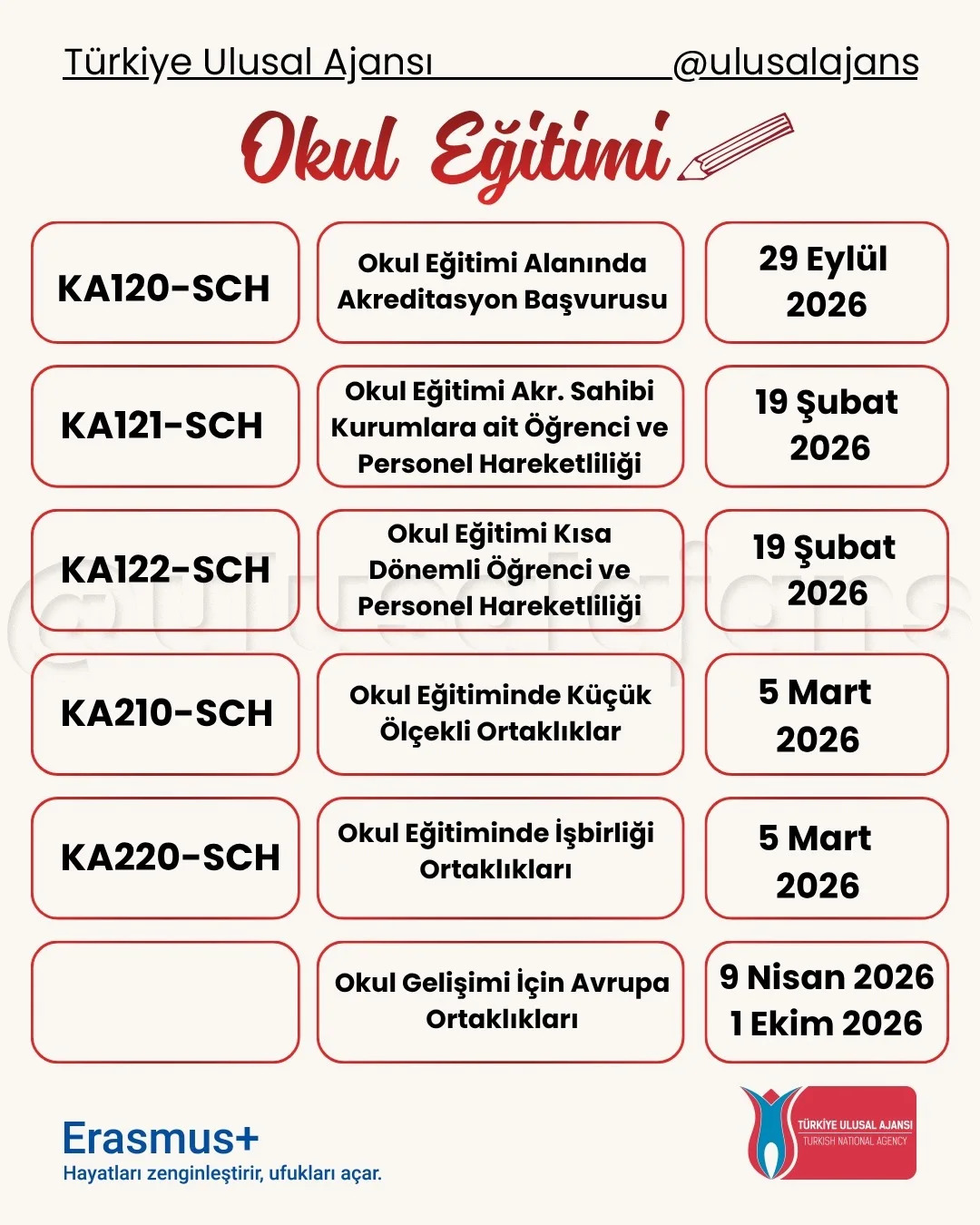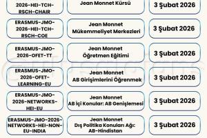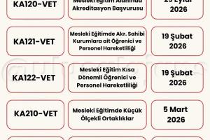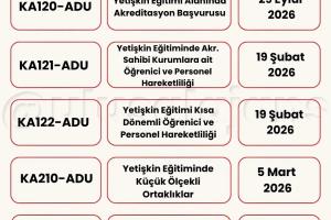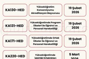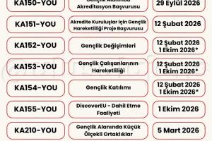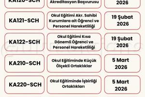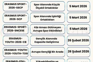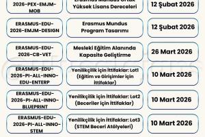 Avrupa Komisyonu, 2026 yılı için Erasmus+ Programı kapsamındaki başvurularla ilgili yeni çağrısını (Call for proposals 2026 - C/2025/06080) duyurdu. Yükseköğretim, eğitim, gençlik, spor ve daha birçok alanda farklı ortaklık ve değişim projeleri için başvuru süreci başladı. Başvuru tarihlerine Türkiye Ulusal Ajansı tarafından hazırlanmış olan aşağıdaki görseller (@ulusalajans) veya bu linkten ulaşabilirsiniz. Aşağıdaki görsellerde kırmızı temaya sahip olanlar ülke merkezli (Ulusal Ajans'a başvuru) olup, mavi temaya sahip görsellerde bulunan çağrılar ise ülke merkezi (AB'ye doğrudan başvuru) projelerdir.