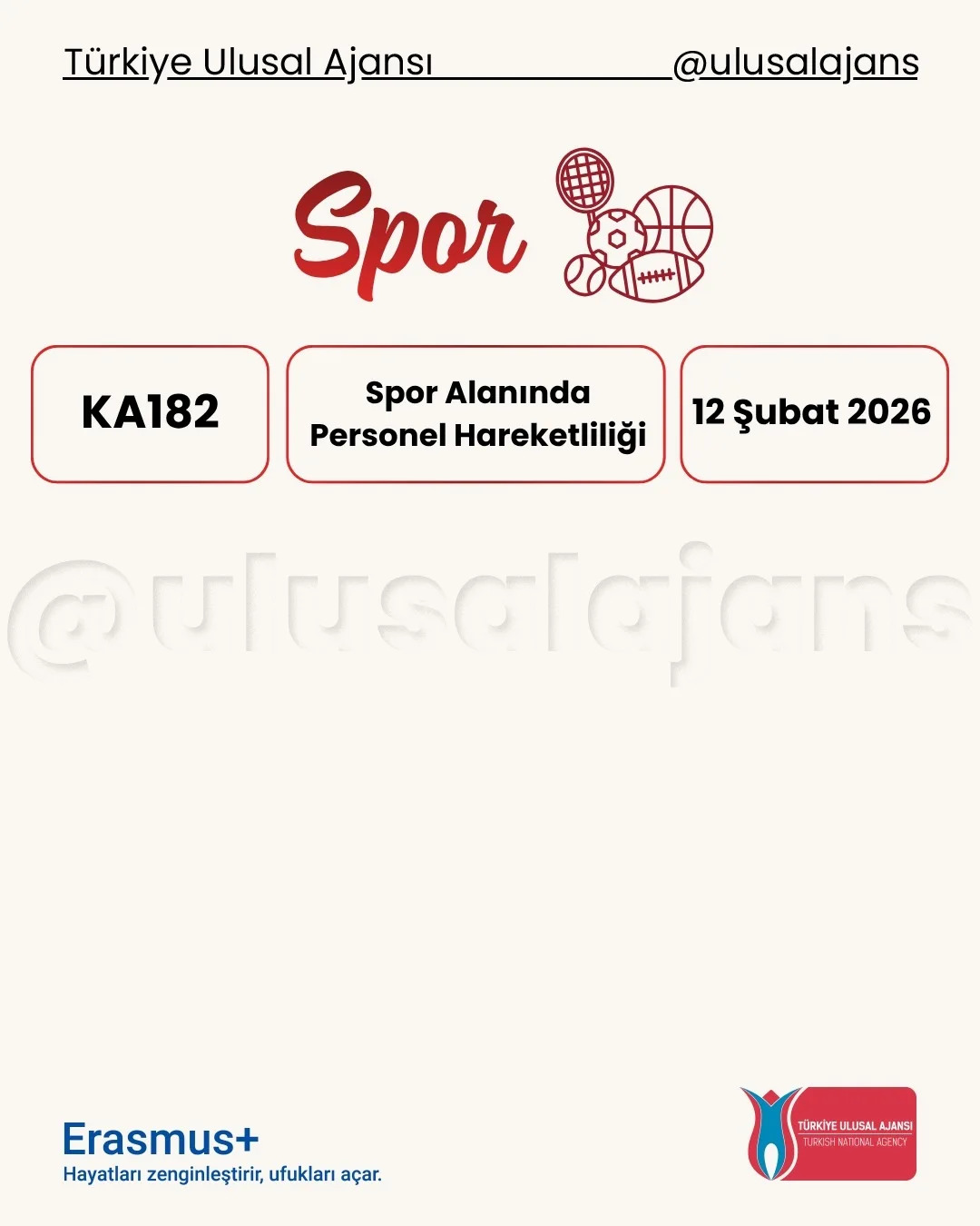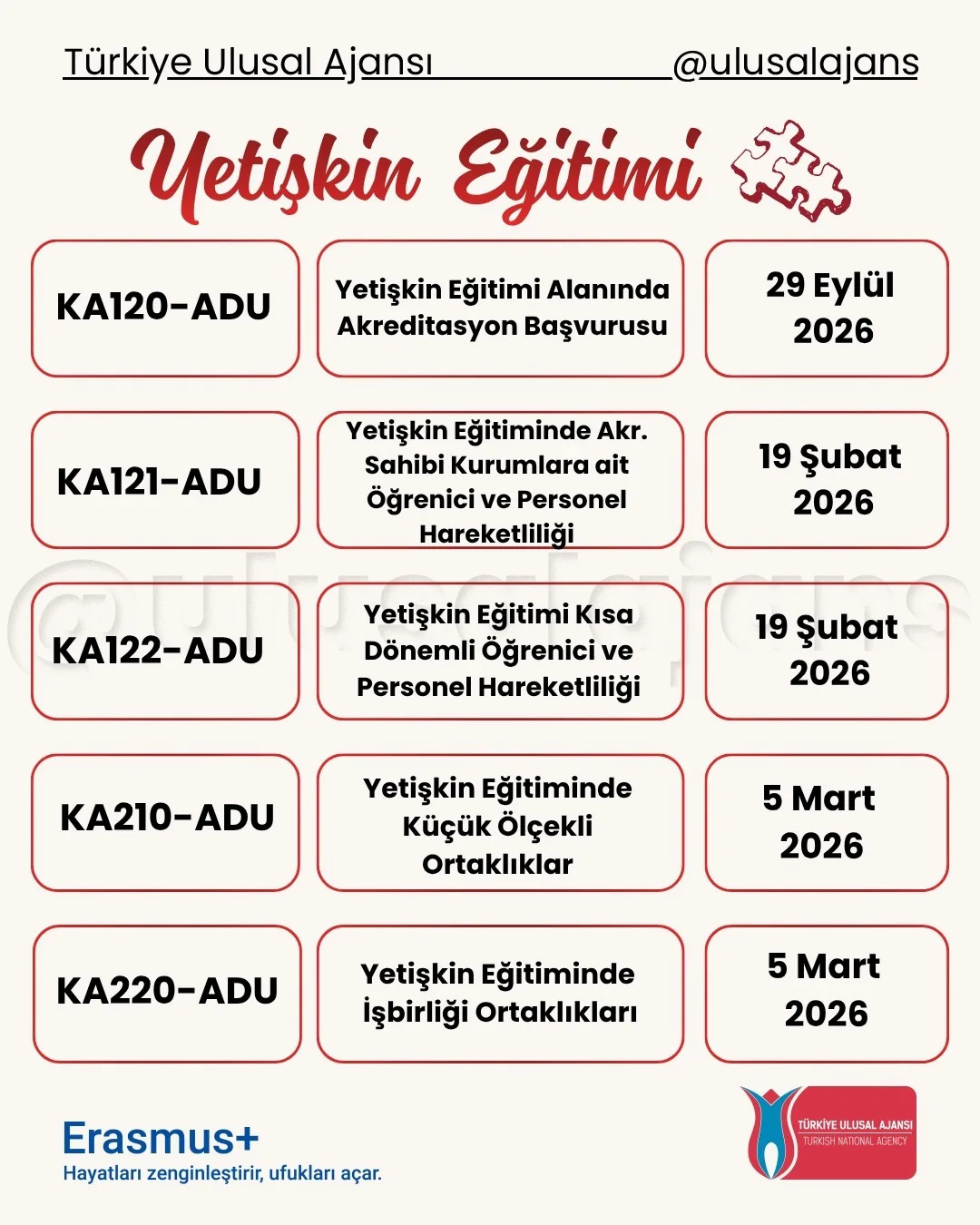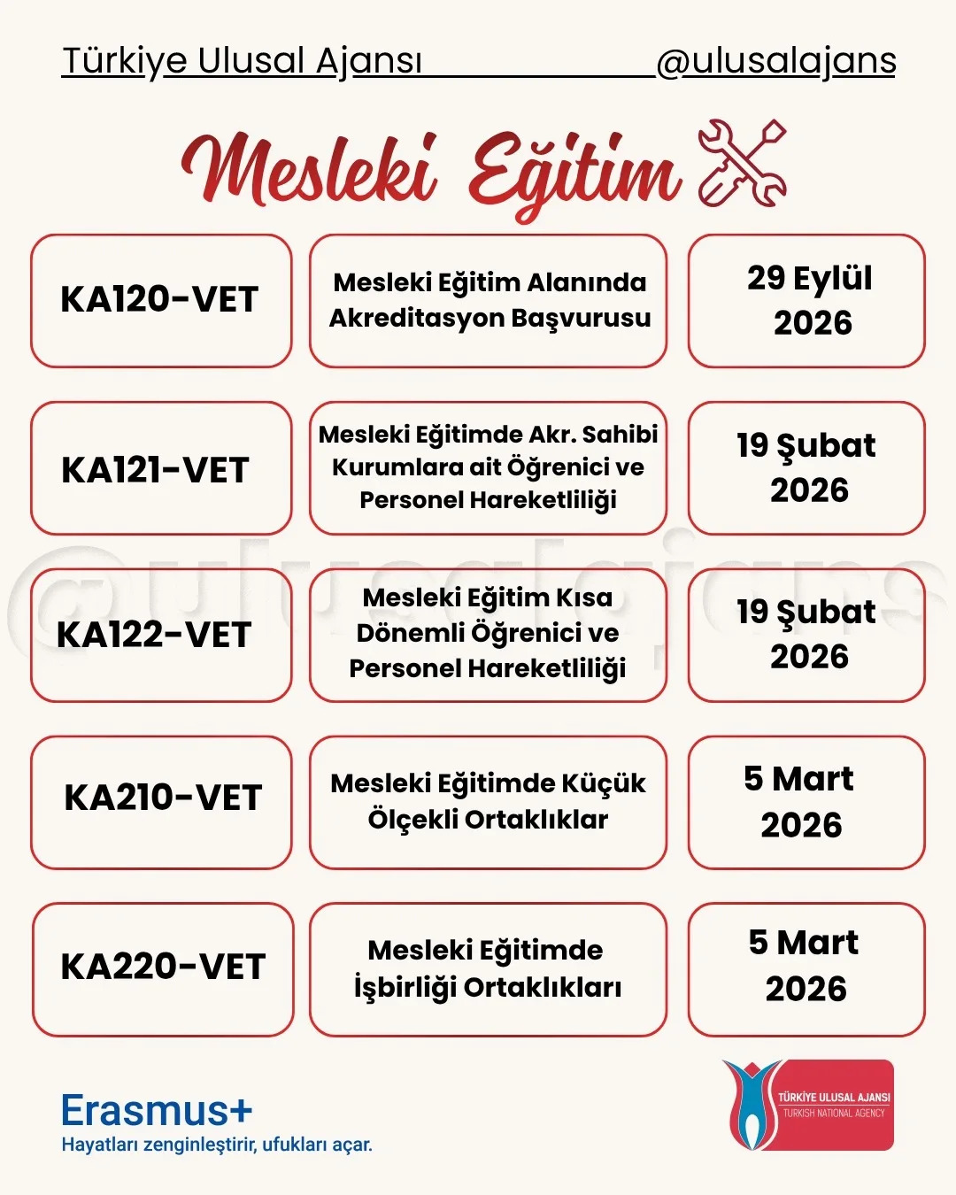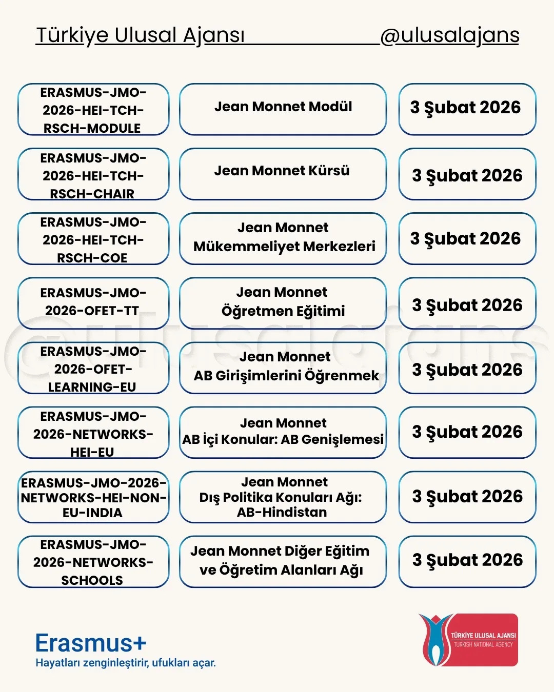 Avrupa Komisyonu, 2026 yılı için Erasmus+ Programı kapsamındaki başvurularla ilgili yeni çağrısını (Call for proposals 2026 - C/2025/06080) duyurdu. Yükseköğretim, eğitim, gençlik, spor ve daha birçok alanda farklı ortaklık ve değişim projeleri için başvuru süreci başladı. Başvuru tarihlerine Türkiye Ulusal Ajansı tarafından hazırlanmış olan aşağıdaki görseller (@ulusalajans) veya bu linkten ulaşabilirsiniz. Aşağıdaki görsellerde kırmızı temaya sahip olanlar ülke merkezli (Ulusal Ajans'a başvuru) olup, mavi temaya sahip görsellerde bulunan çağrılar ise ülke merkezi (AB'ye doğrudan başvuru) projelerdir.
